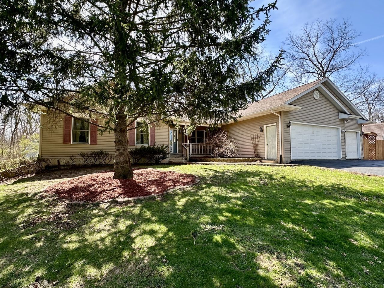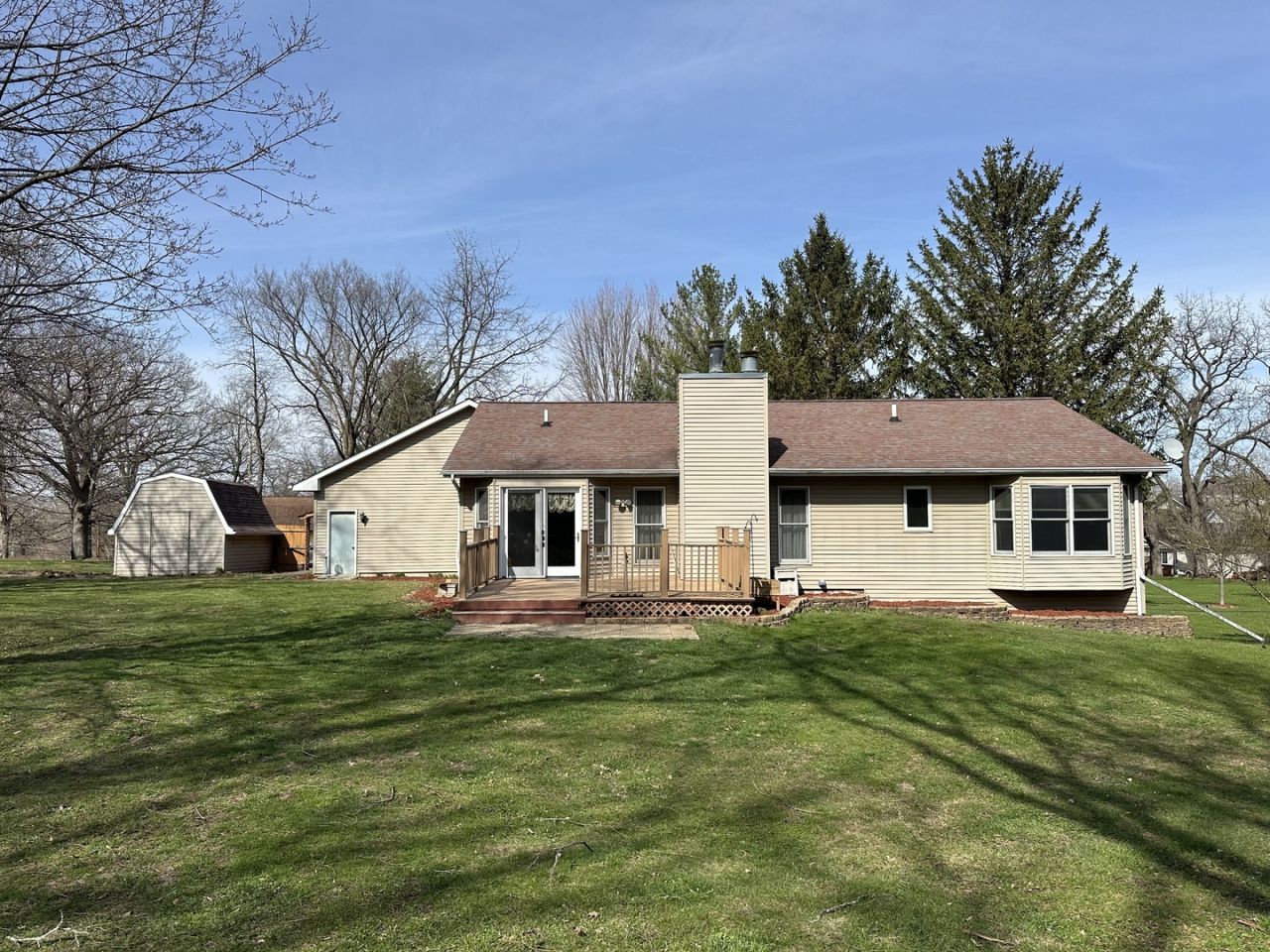 Pictures are coming. Here is a rare one. It feels like living in the country with over 1 acre but with in town convneinece only a few blocks to schools. This home has an open floor plan with vaulted ceiling and fireplace in the kiving room and dining room. There are 3 bedrooms with ceiling fans and 2 1/2 baths on the main floor. The primary bedroom has private bath with whirlpool tub, seperate shower and double vanity. The finished basement adds even more living space with a 2nd fireplace, bar, big rec room and bathroom. Laundry is on the main floor. In addition to the 3 car attached garage there are 2 sheds for bikes or garden tools. There is a deck, patio and firepit in the big backyard that backs up to woods.