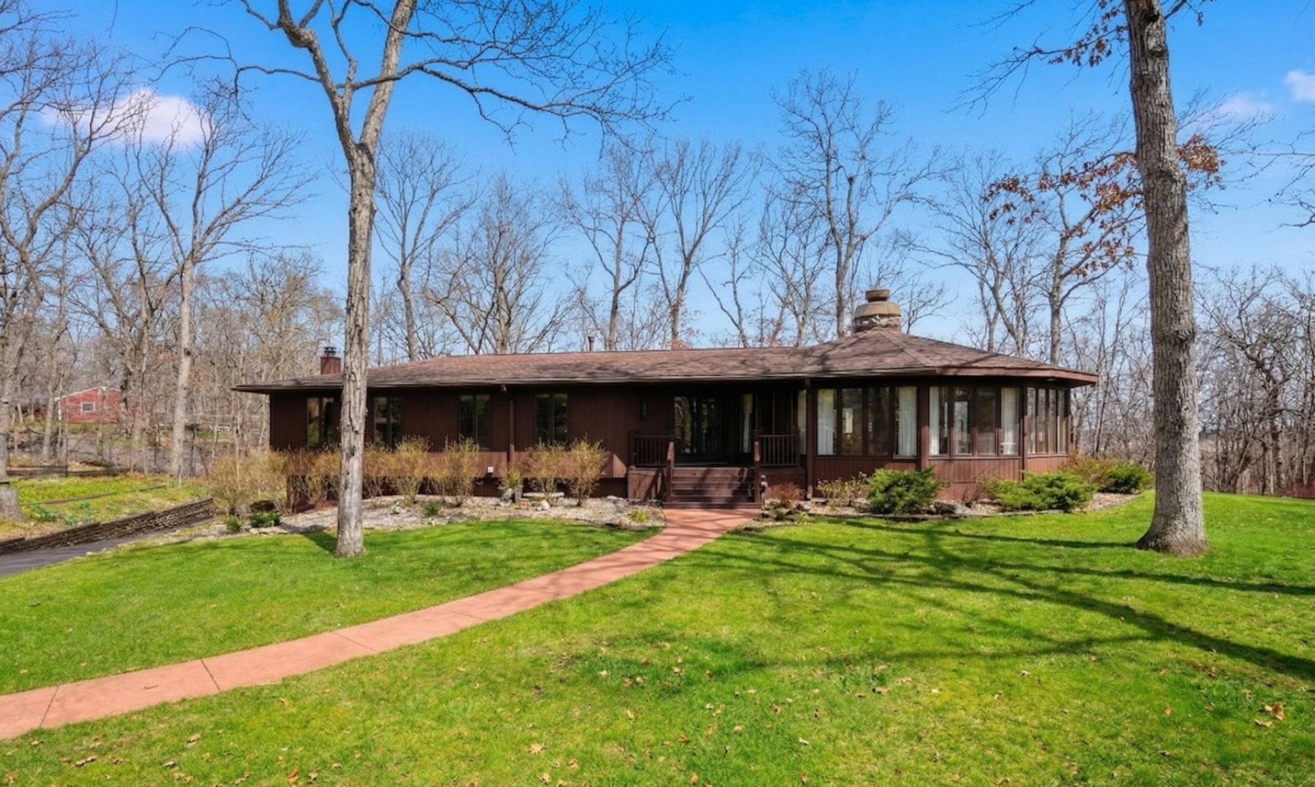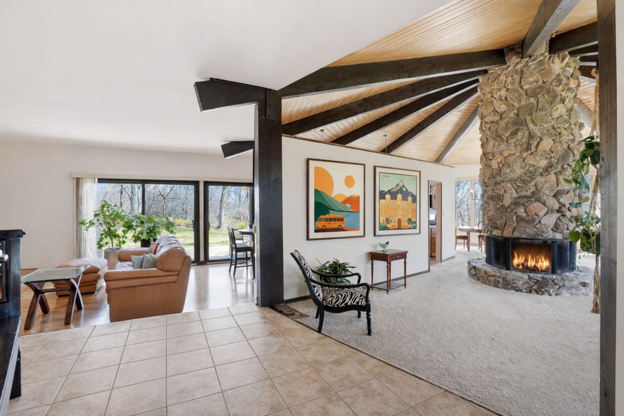 Rarely does a home offer this combination of character, setting, and space. Set back at the end of a peaceful cul-de-sac, this distinctive and truly one-of-a-kind property backs to Deer Grove Forest Preserve, providing a private, wooded backdrop and incredible natural views from nearly every room. The heart of the home is the stunning great room, where a dramatic round stone fireplace anchors the space beneath soaring beamed ceilings. Surrounded by windows on all sides, this living and dining area brings the beauty of the outdoors in, it's a space that truly has to be seen to be appreciated. The kitchen, family room, and all three bedrooms also enjoy magnificent wooded views. The primary has an attached updated bathroom, as well as a walk-in closet. A second bedroom is currently used as an office, with the best mid-century modern, cone fireplace. Additional features are an unfinished basement with abundant storage and a 3-car attached garage. If you've been searching for something truly different, a home with soul, setting, and one-of-a-kind architectural details, this is it. Sold as-is.