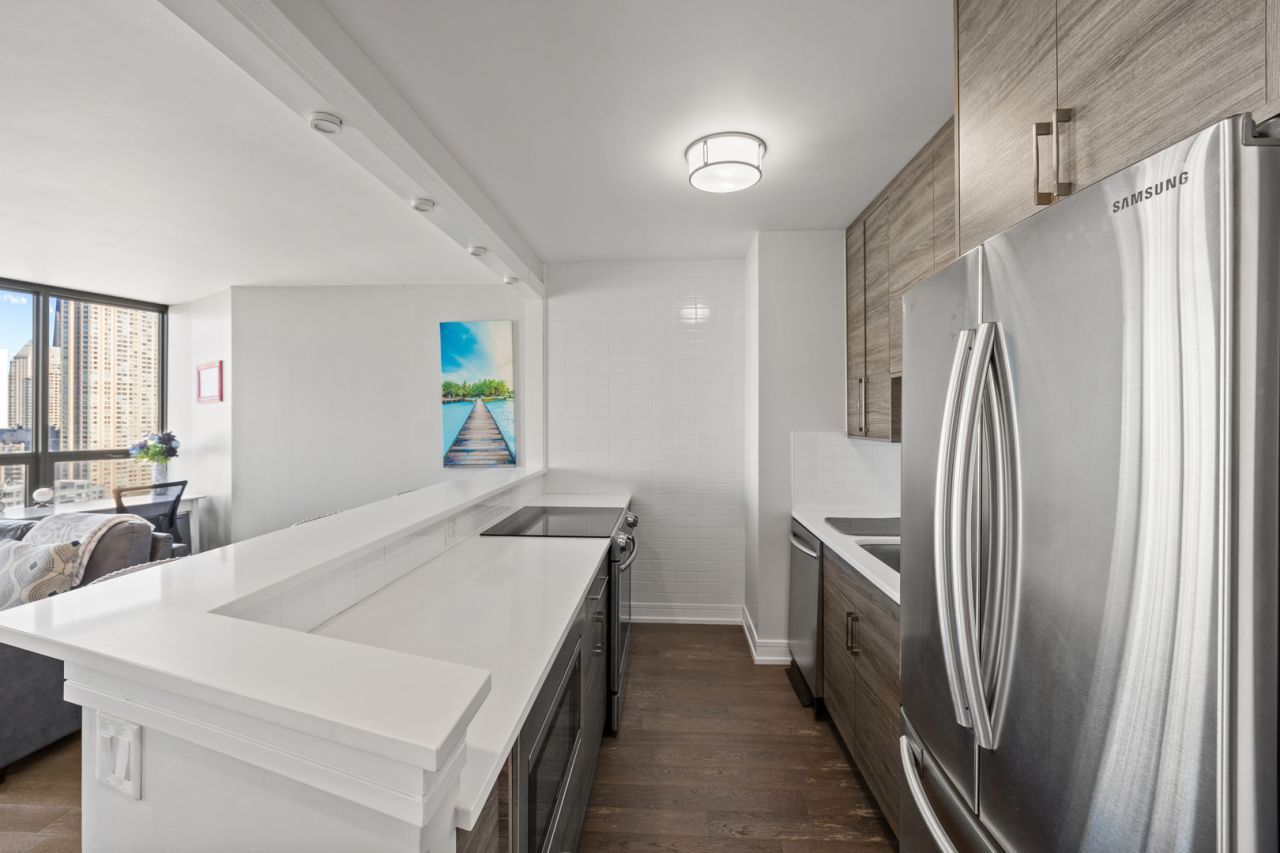 Heart of River North high floor recent (2021) full rehab gem at 400 N. LaSalle. Beautiful city skyline views! Open floor plan featuring custom cabinetry, huge white quartz counter/breakfast bar and stainless appliance package. In unit front load w/d. Juliette balcony. Parking available for lease or purchase. - Full amenity building including gym, outdoor pool, beautifully landscaped patio, part room w/common kitchen and lounge areas, and cleaners/valet. Steps to prime River North restaurants, nightlife, Chicago River, CTA trains, and central loop business and financial district.