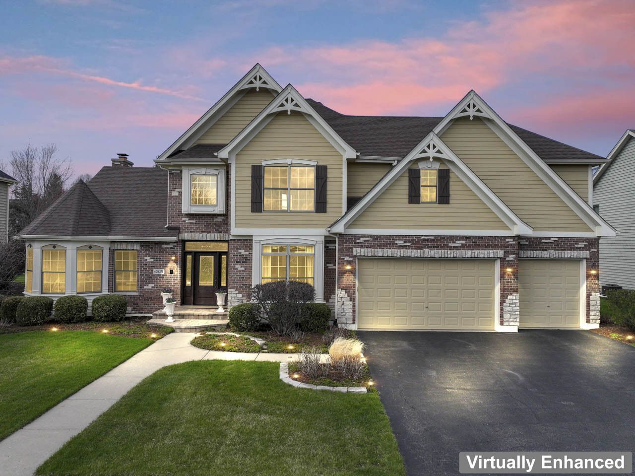 This is the one you've been waiting for. Beautifully designed and thoughtfully updated, this impressive 2-story home offers a wide-open layout filled with custom features and timeless finishes throughout. From the moment you step into the grand two-story foyer, you'll be welcomed by a dual staircase, custom pillars, detailed trim, and crown molding that set the tone for the rest of the home. The formal dining room showcases a stepped tray ceiling, while the private office features abundant natural light and elegant French glass doors perfect for working from home. The heart of the home is the stunning family room with soaring vaulted ceilings and a floor-to-ceiling brick and stone gas fireplace, seamlessly flowing into the spacious kitchen complete with stainless steel appliances, a large walk-in pantry, and a center island ideal for gathering. Just beyond, the sunroom offers vaulted ceilings, walls of windows, and new skylights (2023), creating a bright and inviting space that overlooks the professionally landscaped backyard. Step outside to enjoy the custom brick paver patio with firepit and grill enclosure-perfect for morning coffee, entertaining guests, or simply relaxing at the end of the day. The yard is beautifully maintained with perennials that provide vibrant color throughout the seasons. Upstairs, you'll find generously sized bedrooms, a convenient second-floor laundry room, a Jack and Jill bath, and a private princess suite. The primary suite is a true retreat featuring tray ceilings, custom details, a cozy coffee area with mini fridge, a spa-like bath with double sinks, jet tub, separate shower, and a large walk-in closet with custom organizer (2023). The fully finished basement expands your living space with a large recreation area, game space, 5th bedroom, a fun step-up playroom, full upgraded bath, and ample storage. Additional highlights include hardwood floors, 4.5 baths, Hunter Douglas custom window treatments, Rainbird irrigation system, invisible fence (front and back), and numerous recent updates including new furnace(2023), refrigerator, washer, and sump pump backup (approx. 2 years), new single layer roof (approx. 2.5 years,), exterior paint and caulking (2023), upgraded front door with sidelights and transom (2021), and custom brick paver front steps. Situated directly across from the park and just a short walk to the pool and clubhouse, this home offers both comfort and convenience with exceptional curb appeal and a 3-car garage. This is truly a home you won't want to miss.