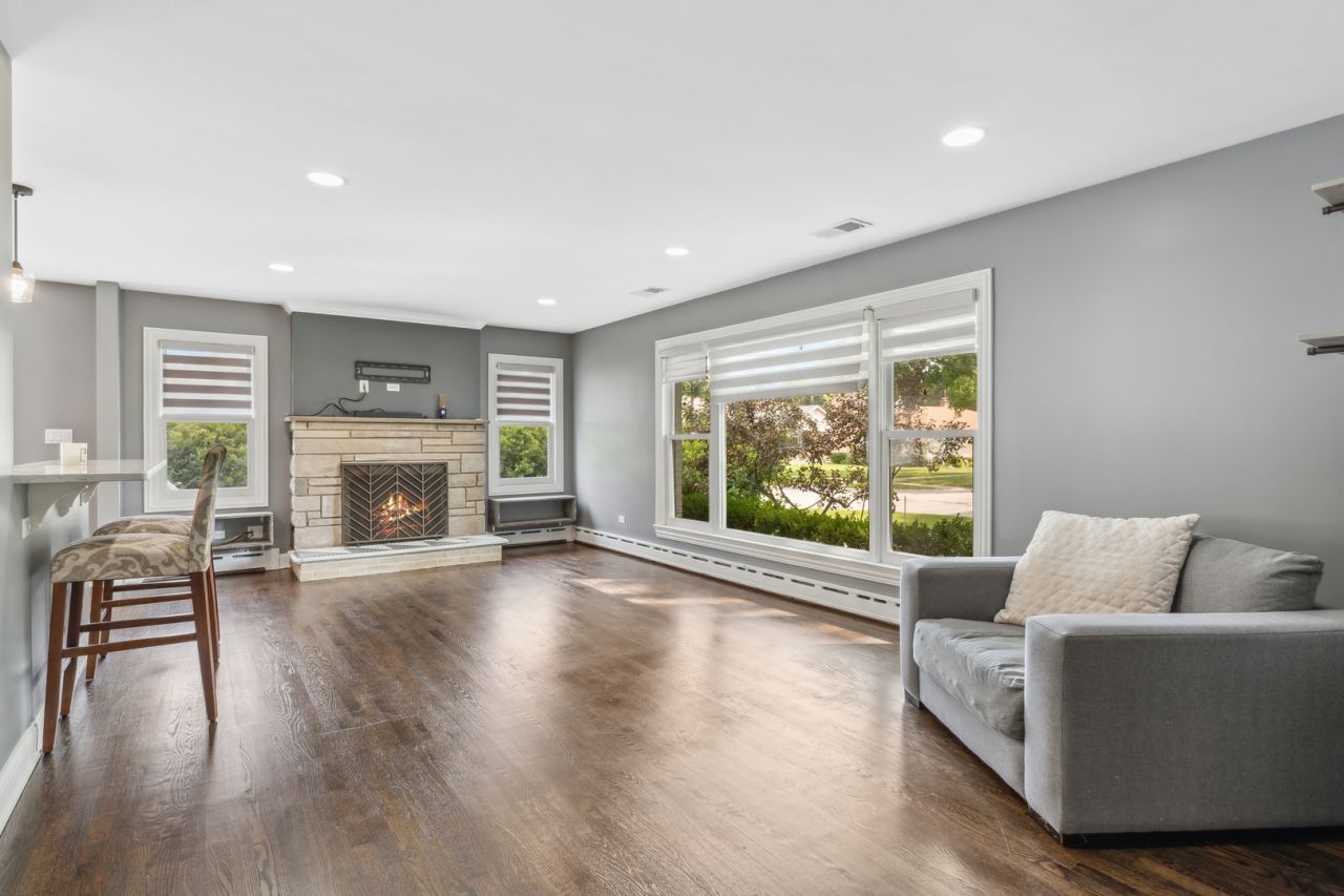 Welcome to this well-appointed ranch, perfectly situated on a picturesque, corner lot and located on quiet tree-lined street in the heart of Libertyville. Inside you'll fall in love with the rich, dark hardwood floors and soft, neutral gray decor that create a warm, modern feel throughout. The sun-filled living room features a decorative brick fireplace and a large picture window showcasing the beautifully landscaped front yard with mature trees. The updated kitchen opens seamlessly to the living space, creating that sought-after great room vibe-perfect for everyday living and entertaining. Enjoy quartz countertops, a tiled backsplash, stainless steel appliances, crisp white cabinetry, and a breakfast bar with stylish pendant lighting. The bedrooms are generously sized and thoughtfully updated with overhead lighting, while select rooms feature charming design touches like Pottery Barn-style drapery rods. Downstairs, the fully finished basement expands your living space with a large rec room, updated full bath, laundry area, and ample storage-ideal for guests, hobbies, or movie nights. A fabulous 3-season room extends the living space, giving lots of flexible options to be used as a dining room, office, craft room, exercise room you decide. This room leads to your fully fenced backyard oasis-perfect for entertaining, relaxing, or letting kids & pets play freely. And don't miss the rare 4-car tandem garage-a dream for car enthusiasts, hobbyists, or anyone needing extra storage space. This extraordinary home truly checks all the boxes-style, space, and location. A 10+! Close to schools, downtown shops/restaurants, expressways and train.